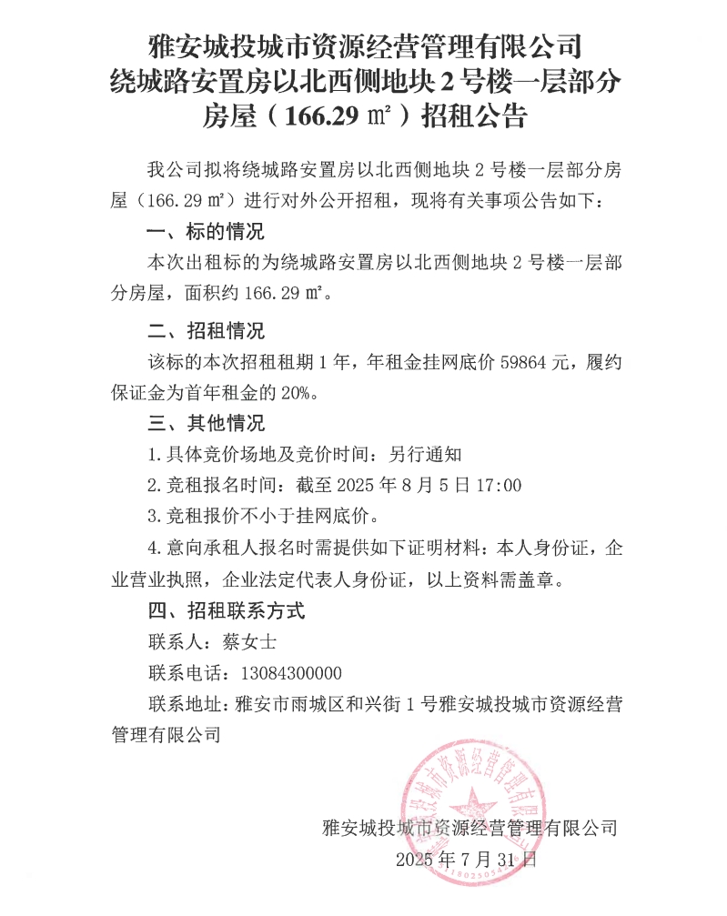 雅安城投城市資源經(jīng)營管理有限公司繞城路安置房以北西側地塊2號樓一層部分房屋(166.29m²)招租公告